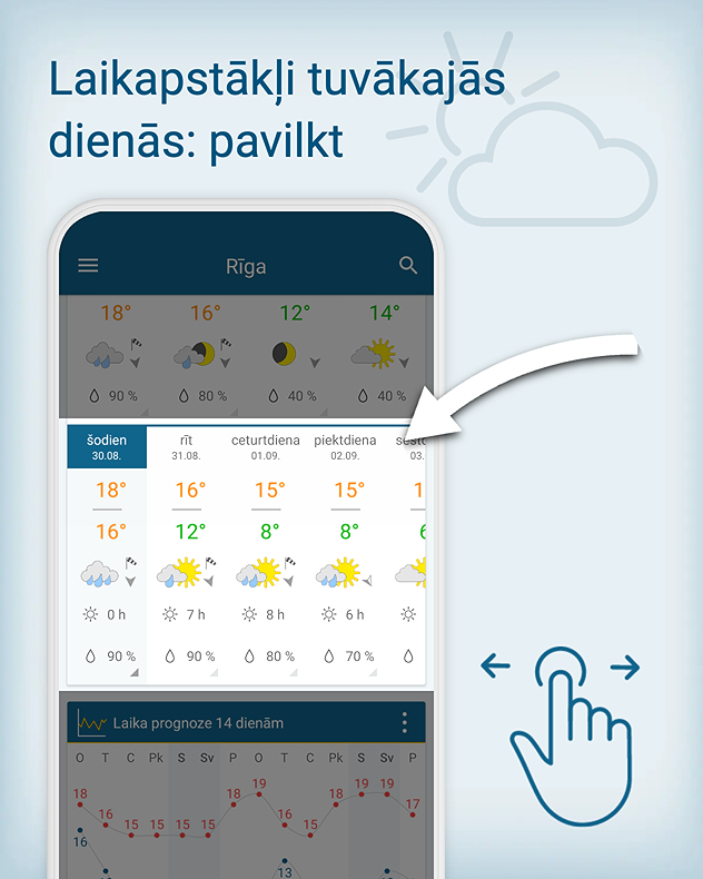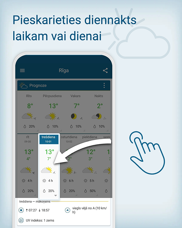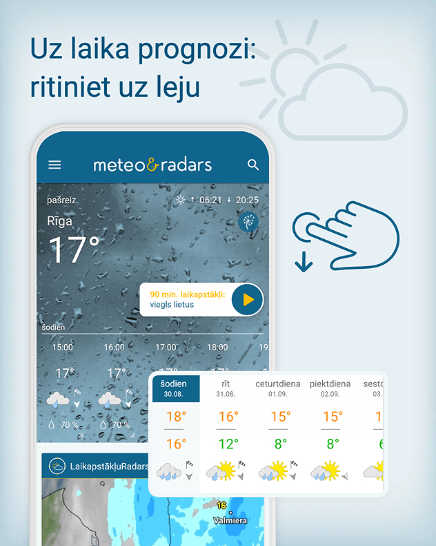Meteo & Radars lietotnē Jūs varat ērti uzzināt, kādi laikapstākļi gaidāmi šorīt, pēcpusdienā, vakarā un naktī. Visu šo informāciju Jūs varat atrast ne tikai LaikapstākļuRadararī, bet arī skaidri un kompakti laika prognozē nākamajām dienām.