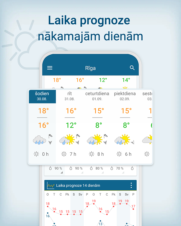 Mūsu precīzā laika prognoze sniedz detalizētu informāciju par sauli, vēju un lietu - Jūsu atrašanās vietai vai jebkur pasaulē.